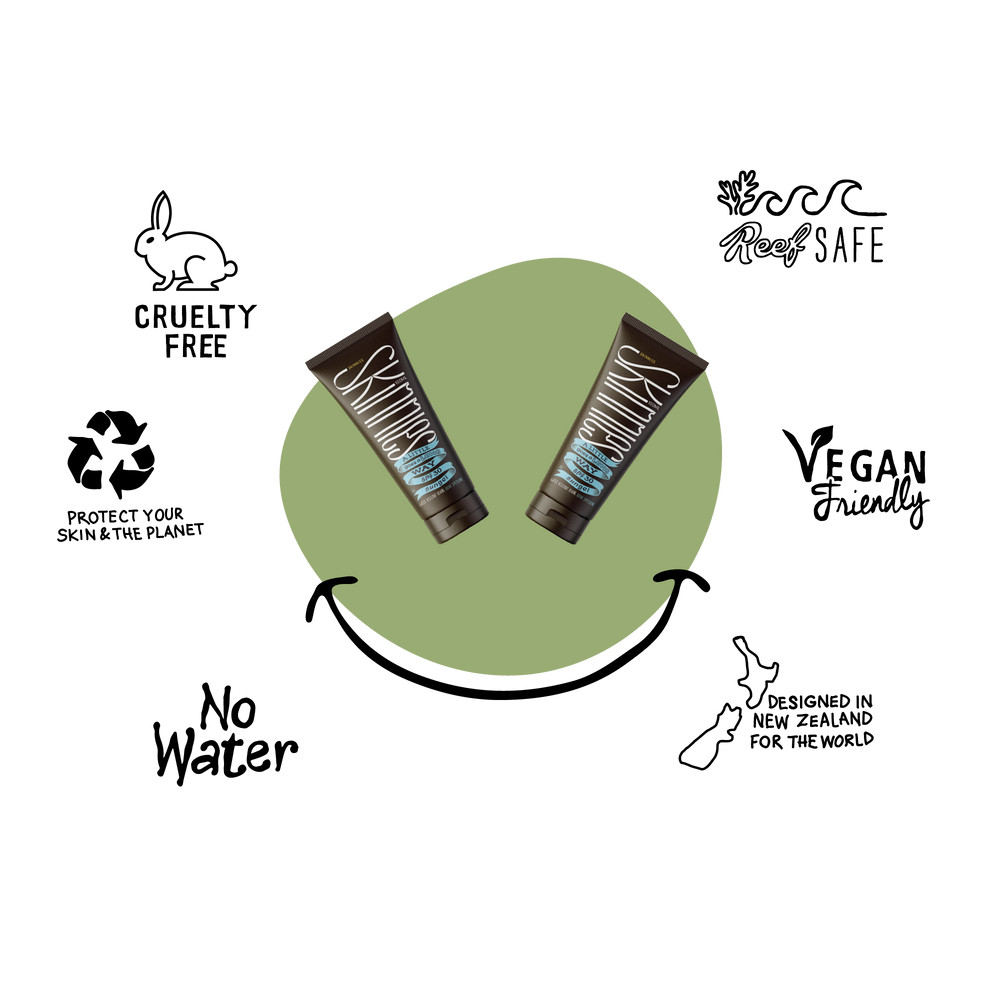 Our philosophy is no water in our products.Water doesn’t protect you from the sunshine. Normal sunscreens are made using 50-70% water (crazy huh!). So we decided to take the water out. This means Skinnies is better for the environment because we’re not wasting water and, because Skinnies isn’t diluted, the sunscreen acts like a concentrate staying on your skin, doing what it should, for longer.